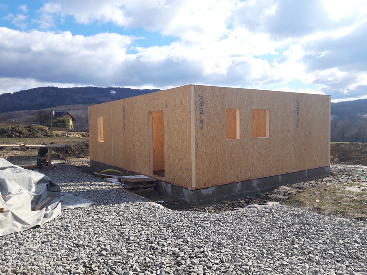 Na ukotvené impregnované zakládací pražce byly osazeny obvodové panely K-KONTROL v tl. 170mm, které jsou mezi sebou prolepeny a prošroubovány dle technologického postupu montáže systému K-KONTROL. Dveřní a okenní otvory jsou vylemovány dřevěnými prvky. Nosné vnitřní příčky jsou namontovány z panelů K-KONTROL v tl. 120mm. Základní rozměr stěnového panelu K-KONTROL je 1220mm x 3000mm.