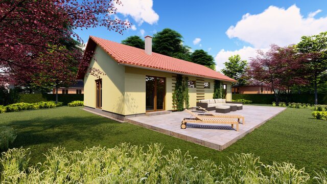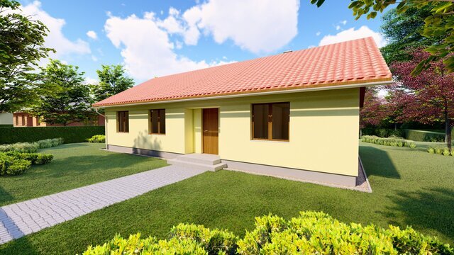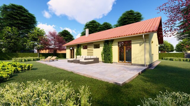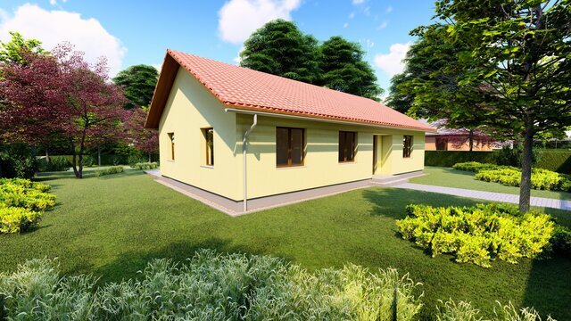 Jako další variantu ABIES nabízíme náš velmi oblíbený jednopodlažní rodinný dům pro 3-4 člennou rodinu ve tvaru sedlové střechy. Design ideálně zapadne do tradičního rázu české vesnice nebo jako rekreační stavba či nové zástavby. Tato varianta nabízí jednoduchý design, který lze navrhnout s vnitřním rovným podhledem stropu nebo přiznat vnitřní sklon střechy do interiéru. Obojí lze zkombinovat a vytvořit tak praktické podkroví, kde sedlovou střechu lze doplňit o střešní okna nebo vikýře. Pro tento případ doporučujeme navrhout střešní plášť ze stavebního systému K-KONTROL®. Typ krytiny u domu ABIES se sedlovou střechou může být jakýkoli . Návrh domu klade velký důraz na minimální investiční i provozní náklady.