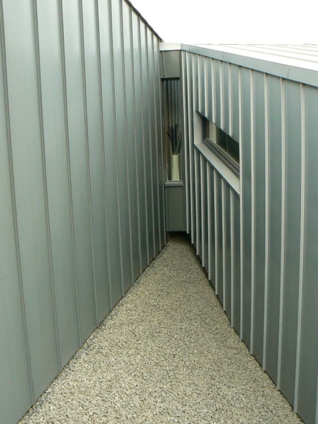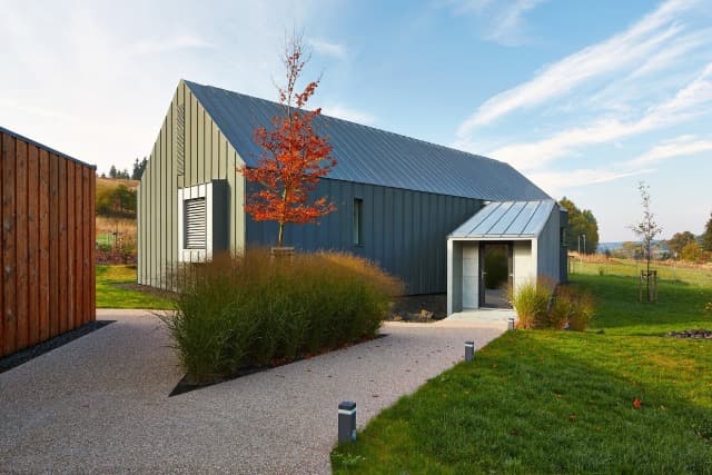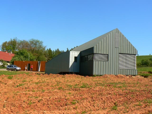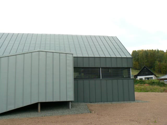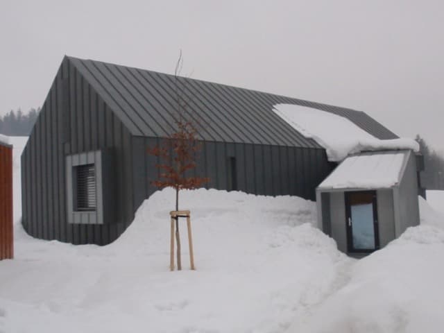 Střecha a fasáda byla provedena z materiálu RHEINZINK – „předzvětralý pro břidlicově šedý“ (dnes prePATINA schiefergrau) na dvojitou stojatou drážku a úhlovou stojatou drážku strojně profilovanou na místě. Část vystupující špalety koupelny a vstupní krček je proveden z materiálu RHEINZINK – „předzvětralýpro modrošedý“ /prePATINA Blaugrau/.