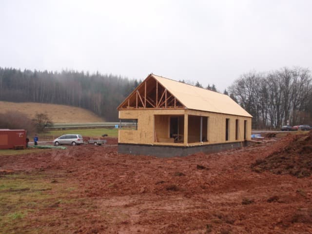 Dům je navržen jako dřevostavba ze systému K-KONTROL® tl. 210 mm s ext. zateplením 120 mm a předsazeným větraným opláštěním. Objekt je přízemní s nezatepleným nevyužívaným půdním prostorem a sedlovou střechou. Pro vyrovnání výšek na úpatí svahu byl navržen vstupní krček – jako zádveří/schodiště/šatna - se samostatným WC na podestě. Vstup svírá s objektem úhel 20° a je odsazen na šířku průhledu kvůli padajícímu sněhu a také pro vyhlídku na opláštění a stojaté drážkování.