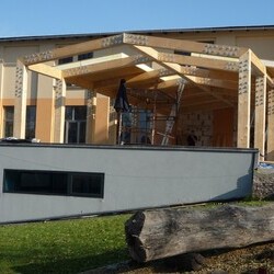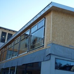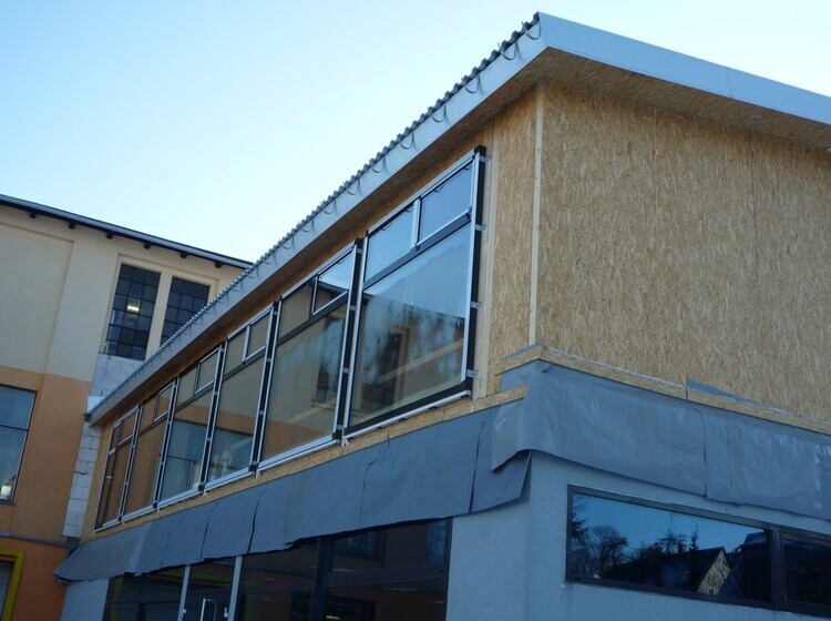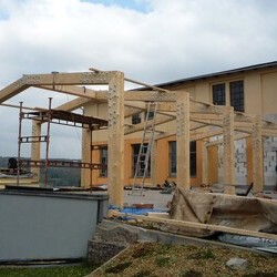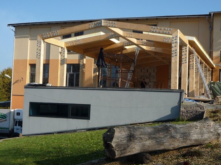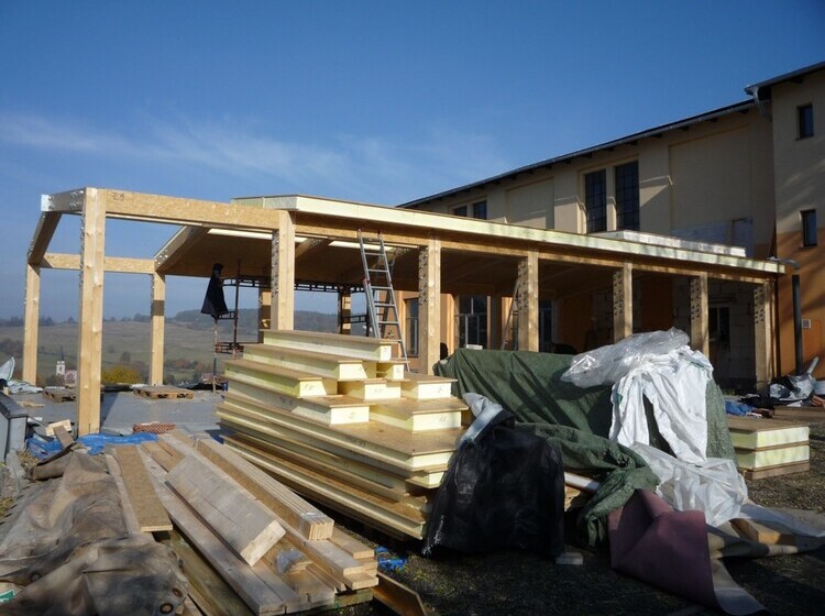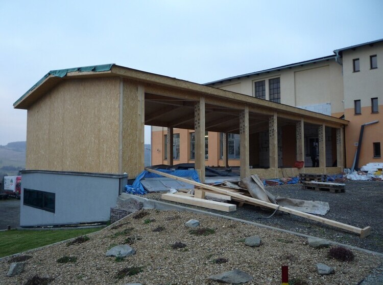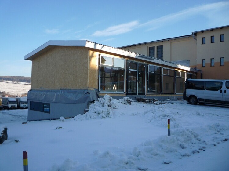 Nástavba skladovací haly v Jířetíne pod Jedlovou. Dřevěná rámová nosná konstrukce opláštěná panely ze systému K-KONTROL.
