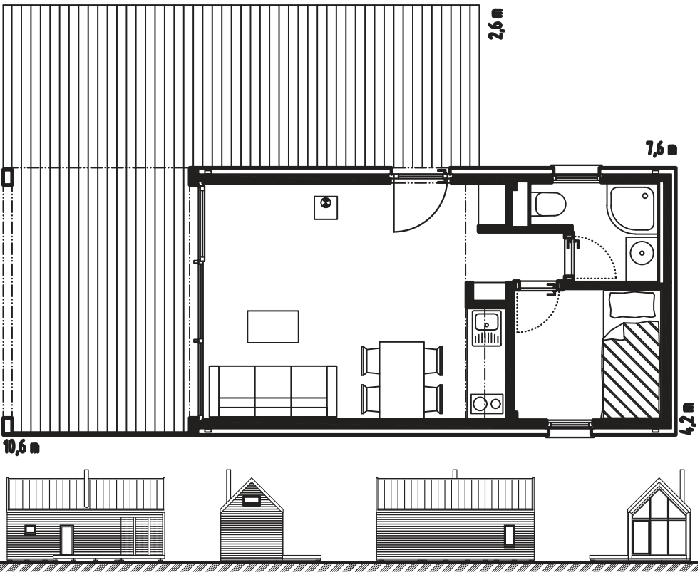 Rekreační chata Forest Garden Family nabízí výjimečný prostor pro odpočinek a relaxaci čtyř osob. Celoprosklený štít poskytuje dokonalé propojení s venkovním prostorem a zastřešená terasa se závětřím umožňuje venkovní posezení i v deštivých dnech. Díky střeše bez přesahů působí chata moderním designem. Chatu Forest Garden Family je možné také realizovat v zrcadlově převráceném provedení.