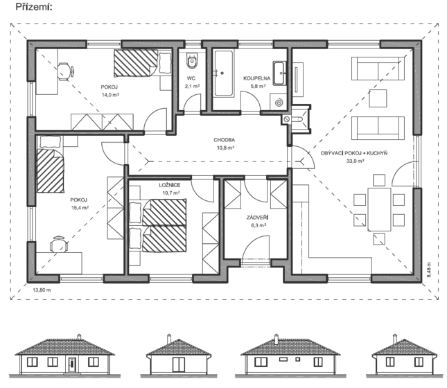 Abies is a single-storey family house for a family of three or four. This house requires minimum investment and minimum operational cost. The truss roof frame is designed to enable the utilization of the garret for storage. Thanks to a simple supporting construction the interior of the house can be adapted according to customer requirements. The house can be built in reverse projection.